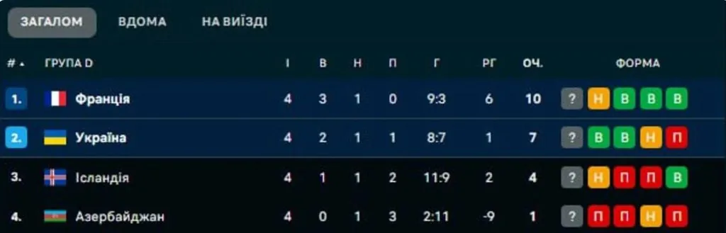 Наразі національна команда України посідає 2 місце із сімома очками. Франція натомість ж йде першою із 10 заліковими балами в активі.