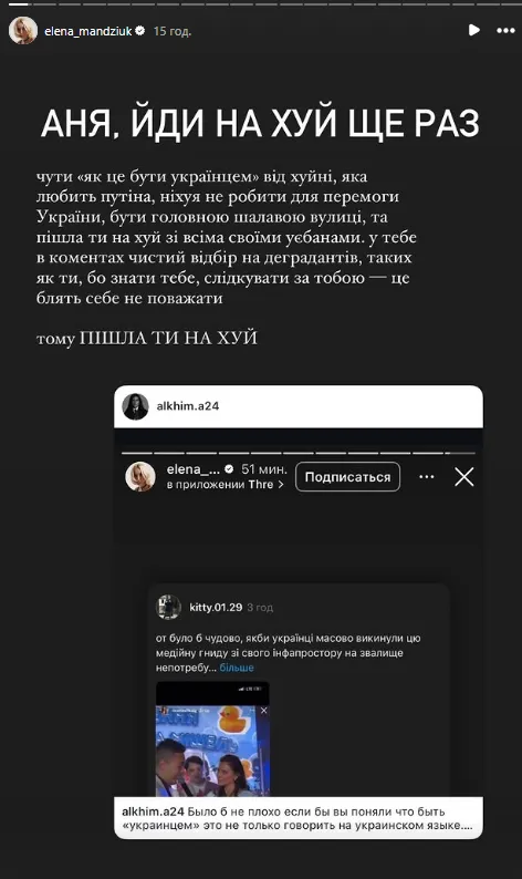 «Можливо, колись я теж не очікувала від себе такої прямолінійності, але, відверто — наше суспільство деградує з подібними «алхім». Поки найкращі гинуть, інше болото має змогу розростатись… Цього не можна дозволяти», – заявила Мандзюк.