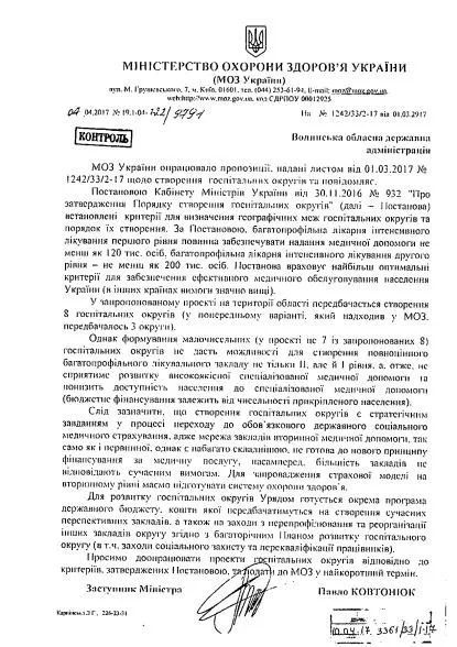 Про недотримання критерію щодо кількості населення, яке буде обслуговуватися в одному госпітальному окрузі, кажуть і у міністерстві. Зокрема, у листі за підписам заступника міністра охорони здоров’я Павла Ковтонюка зазначається: “У запропонованому проекті на території області передбачається створення 8 госпітальних округів (у попередньому варіанті, який надходив у МОЗ, передбачалося 3 округи). Однак формування малочисельних (у проекті це 7 із запропонованих 8) госпітальних округів не дасть можливості для створення повноцінного багатопрофільного лікувального закладу не тільки ІІ, але й І рівня, а отже не сприятиме розвитку високоякісної спеціалізованої медичної допомоги (бюджетне фінансування залежить від чисельності прикріпленого населення)”.