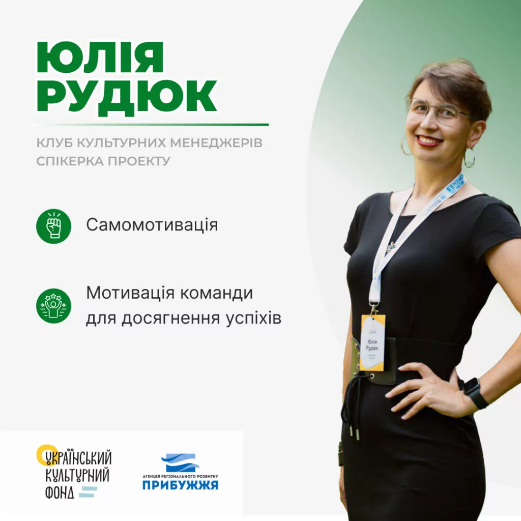 Юлія Рудюк – керівниця ГО «Львівський культурний центр», менеджерка міждисциплінарних проєктів, керівниця проєкту Благодійного фонду «Запорука», тренерка з організаційного розвитку.