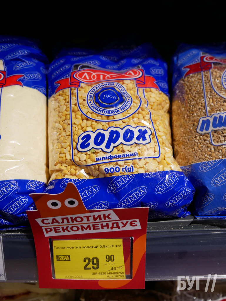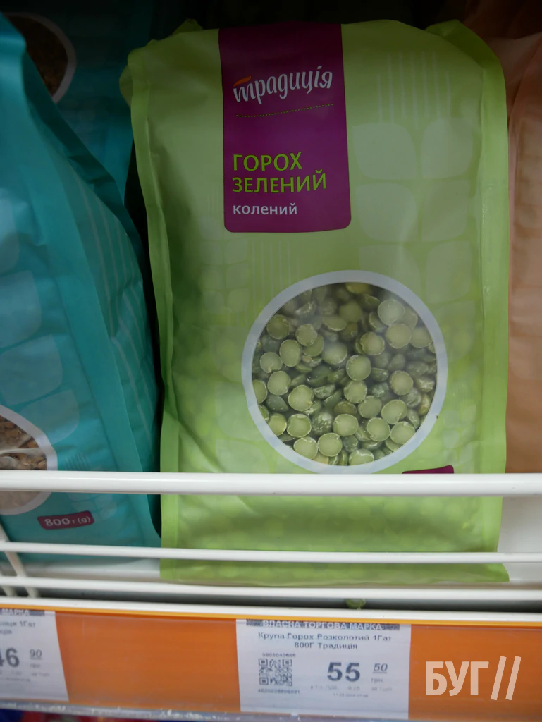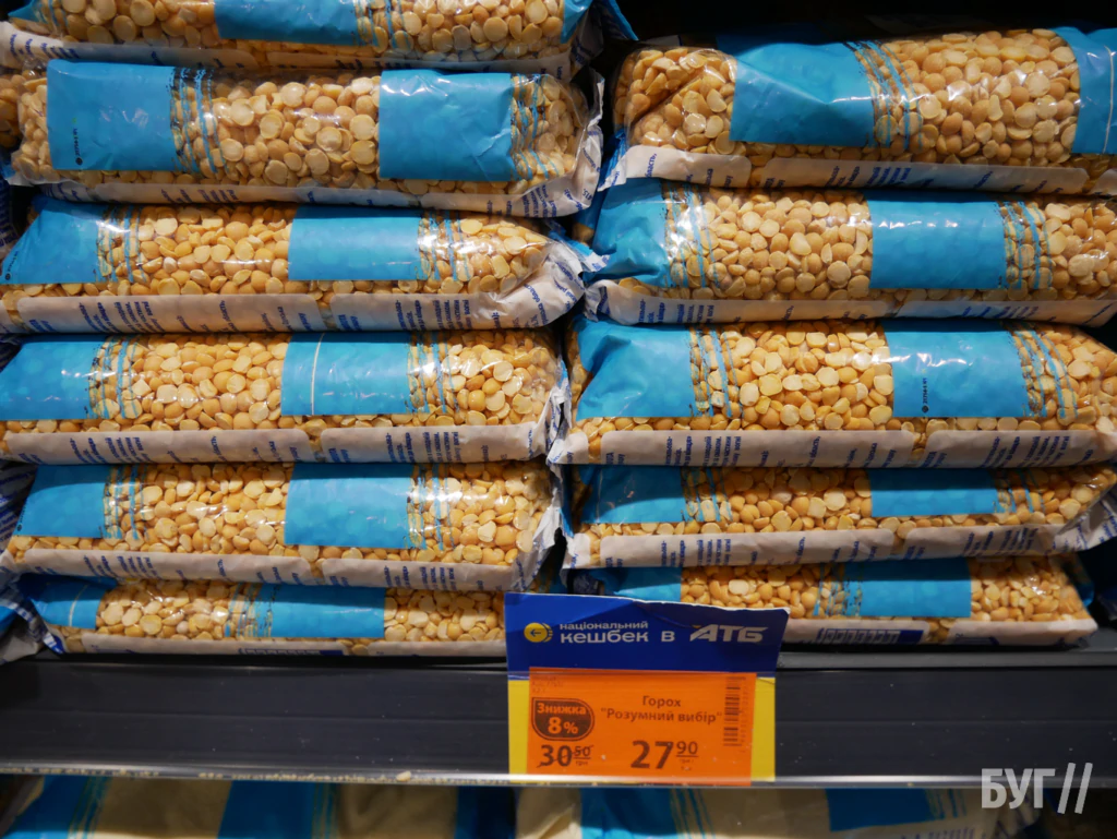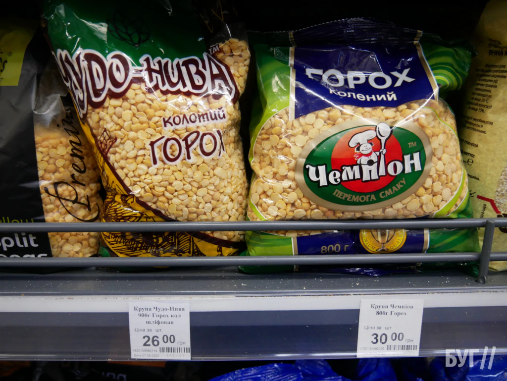 У «Нашому краї» ціна на горох найнижча: 26–30 грн, у «АТБ» — 27,90 грн (акція) або 30,50 грн, у «Салюті» — 29,90 грн за акцією чи 40 грн стандартно, у «Кіопаку» — 35,50 грн, у «Рукавичці» — 32,50–55,50 грн залежно від виду.