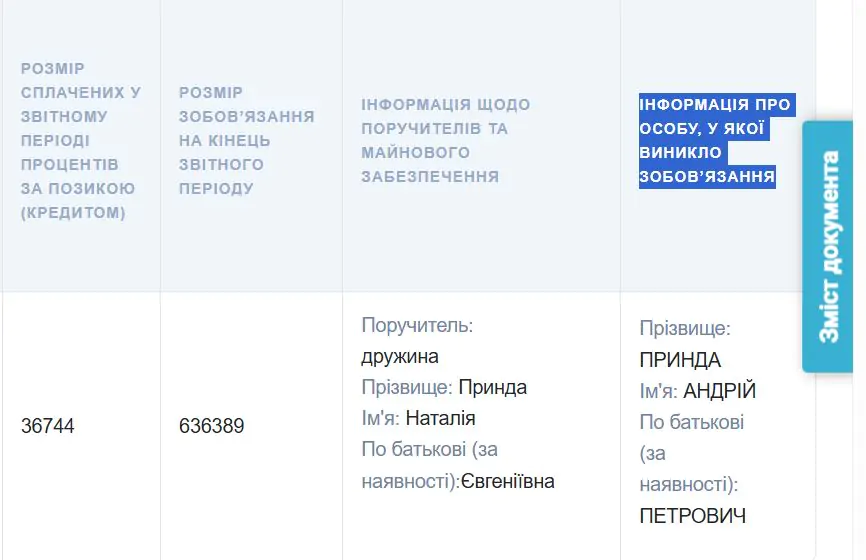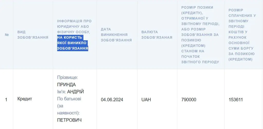 В декларації за 2024 рік Андрій Принда зазначив позику на 790 тисяч гривень, яку отримав 4-го червня 2024 року. 153 тисячі 611 гривень боргу та 36 тисяч 744 гривні відсотків депутат вже сплатив. Залишилось на кінець 2024-го повернути 636 тисяч 389 гривень.