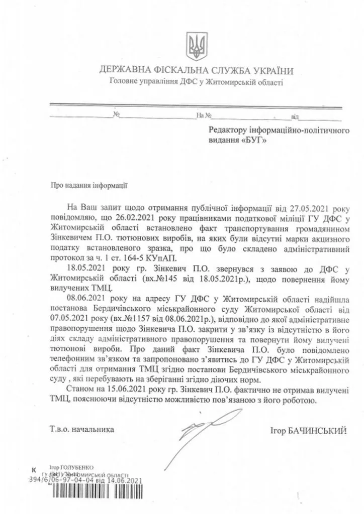 Як повідомили БУГу в Головному управлінні ДФС у Житомирській області, 18-го травня громадянин Зінкевич звернувся з заявою, щоб йому повернули вилучені товарно-матеріальні цінності. Проте поки до управління він так і не з’явився, пояснюючи це відсутністю можливості у зв’язку з роботою.