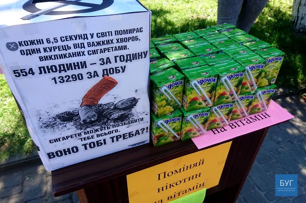 “Подібна акція пропагує здоровий спосіб життя і ми як працівники центру соціальних служб для сім’ї, дітей та молоді не могли залишитися осторонь. Сьогодні на головній площі міста обмінюємо цигарки на сік. Сік значно корисніший”, – розповіла директор центру Ірина Пикалюк.