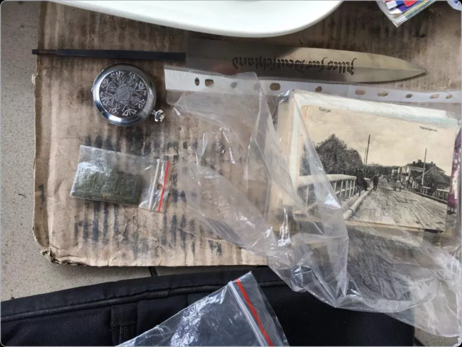 Зокрема, на дні картонної коробки з особистими речами лежав металевий клинок без рукоятки з гравірувальним написом «Alles fur Deutschland». Крім того, у папці темно-зеленого кольору виявлено 59 листівок різних років випуску, які мають ознаки культурних цінностей. В одній з кишень дорожньої сумки чоловік приховав кишеньковий годинник, а в поличці під кермом автомобіля – ікону.