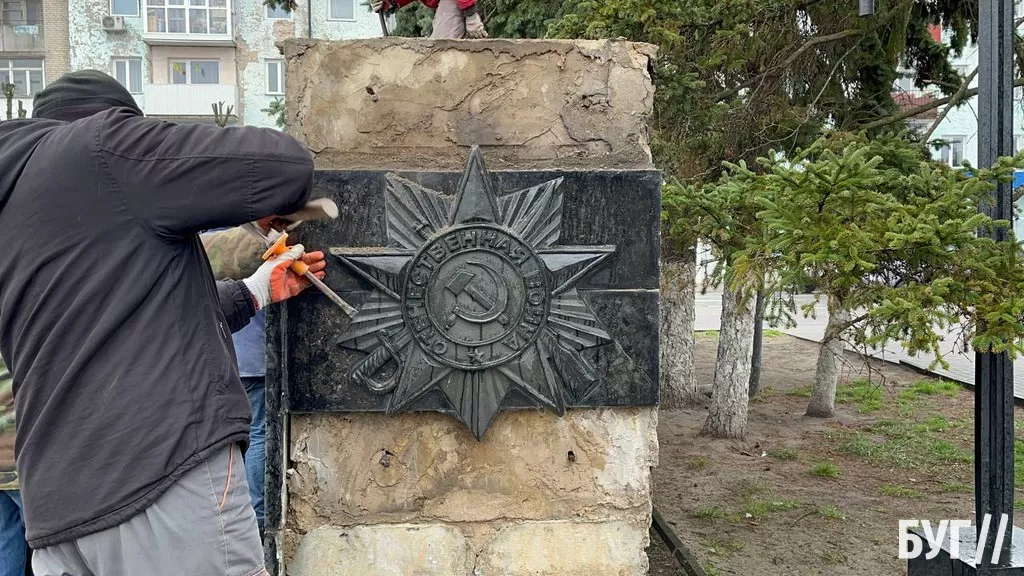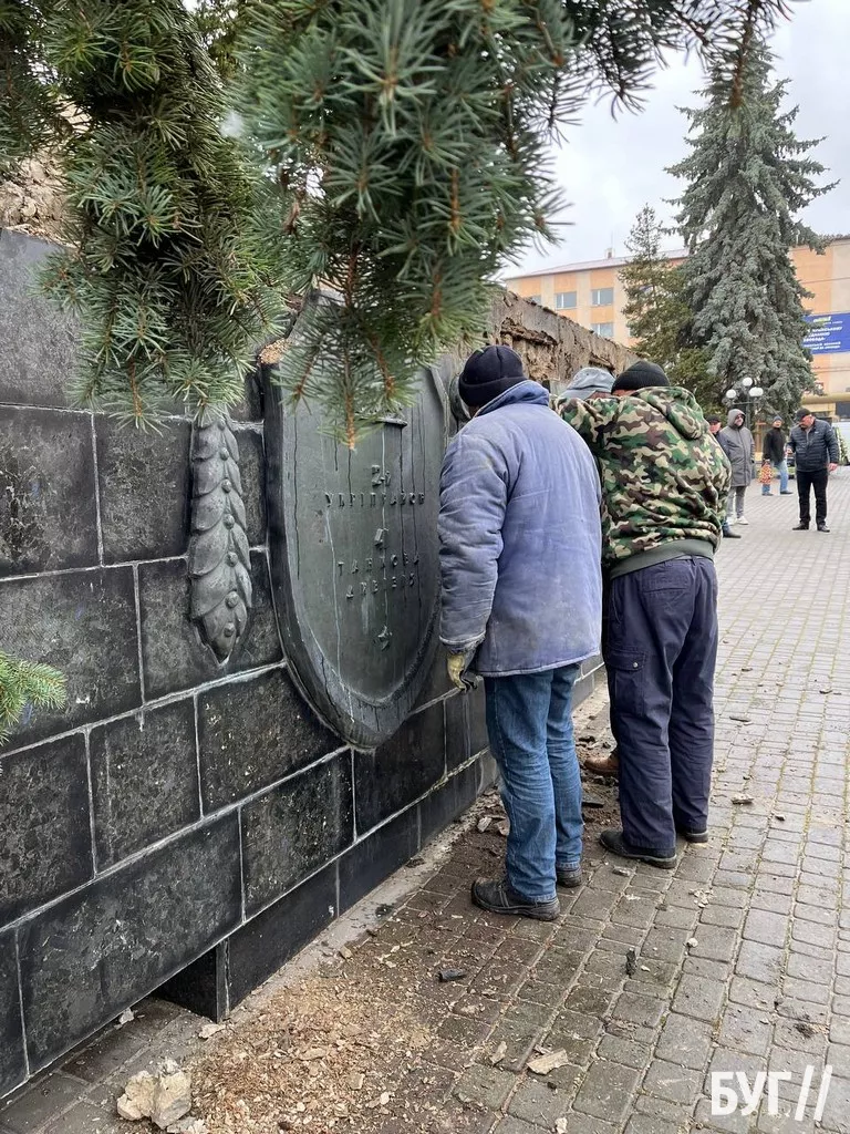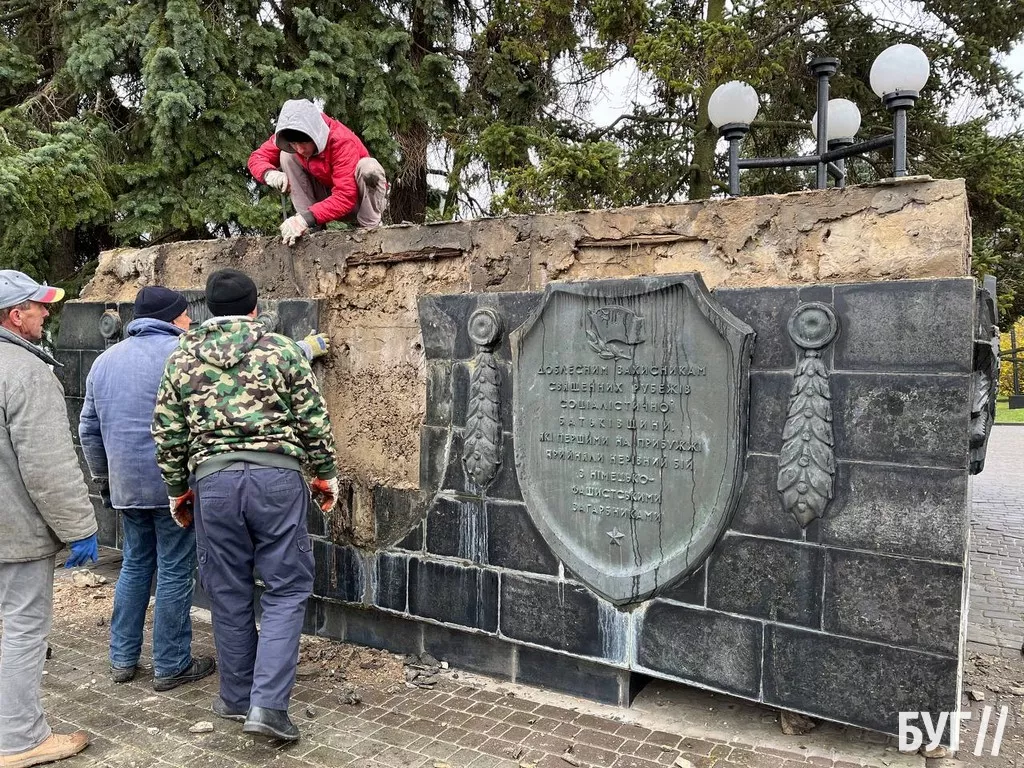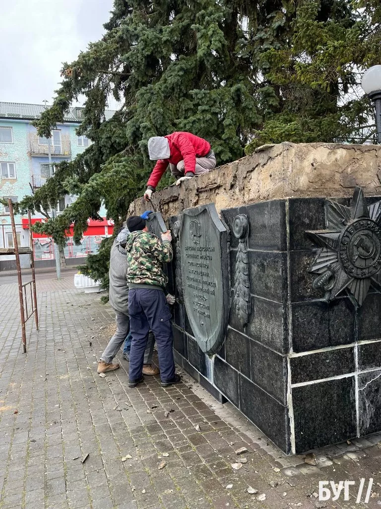 Роботи виконували працівники комунального підприємства “Полігон”. Демонтовані бронзові елементи у формі радянських зірок та меморіальні дошки, що були розміщенні на “тумбах” передадуть на зберігання у міський музей.