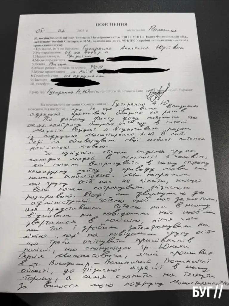 “Особисто я звернулась до адміністрації готелю і попросила заспокоїти їх, але на жаль адміністрація готелю сказала, що немає такої компетенції та, якщо мене щось турбує, я можу викликати наряд поліції. Коли я повідомила дану групу осіб, що викликала поліцію, вони не заспокоїлись. Навпаки, навіть в присутності патрульної поліції, Сергій Юнак напав на мою подругу з кулаками, поки я писала заяву”, – зазначає блогерка.