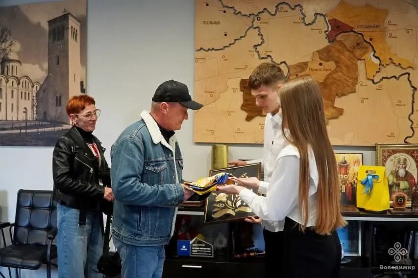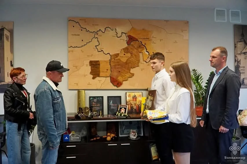 На згадку старшокласники ліцею імені О. Цинкаловського подарували військовому картину, виконану в техніці соломкарства, та прапор із підписами подяки від молоді. Від імені громади міський голова вручив Герою вишиванку, а його дружині Оксані – квіти.