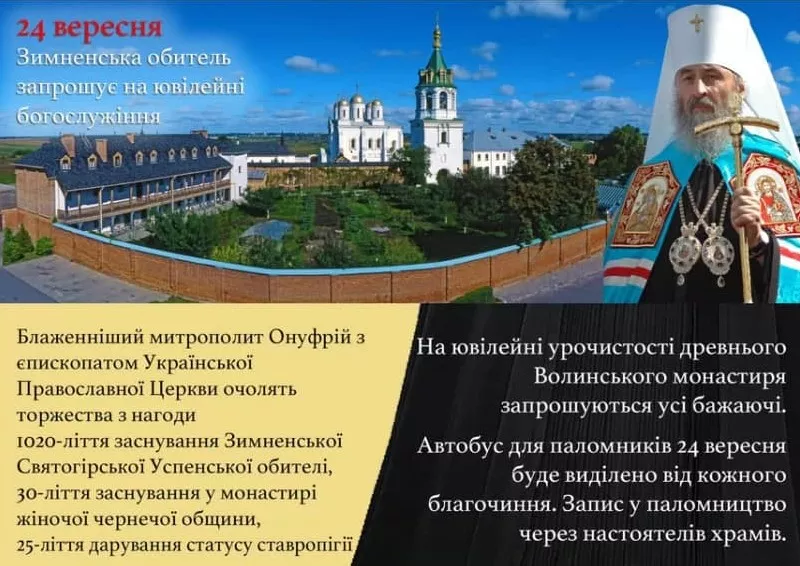24-го вересня в село Зимне Зимнівської громади Володимир-Волинського району з нагоди ювілейних дат заснування та відродження Святогірського Успенського Зимненського монастиря приїде предстоятель УПЦ митрополит Онуфрій.