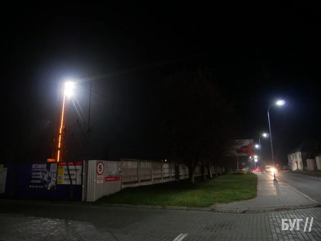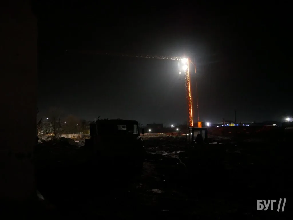 Попри холодну пору року, роботи на об’єкті тривають, а освітлення крана стало яскравим акцентом у вечірньому місті.