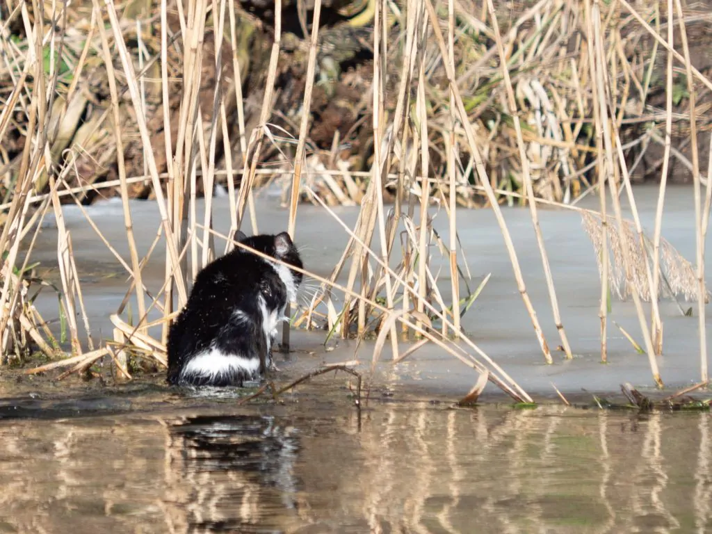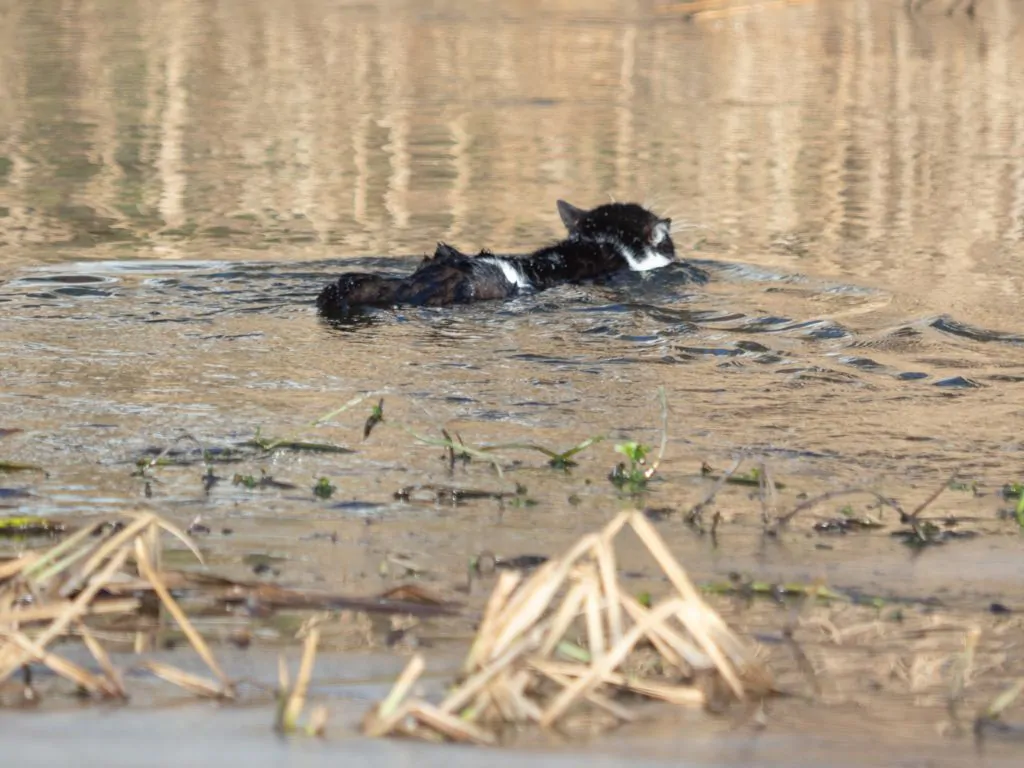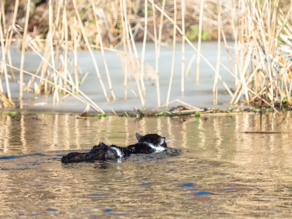 Весна вже прийшла, але річка Луга ще зберігає сліди зими – біля берега видно залишки льоду, що повільно тануть під променями сонця. Саме серед цих холодних вод відбулося несподіване видовище: чорно-білий кіт сміливо пливе у річці, ніби це його звичне середовище. Його мокра шерсть прилипає до тіла, а голова гордо здіймається над водою.