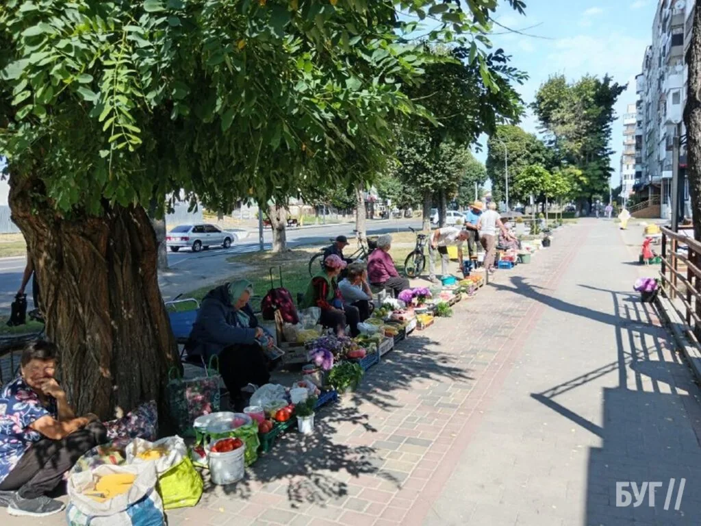 Уздовж тротуару біля магазину «SPAR» у Володимирі розгортається невеликий стихійний ринок, де місцеві жителі пропонують городину, квіти та домашні смаколики.