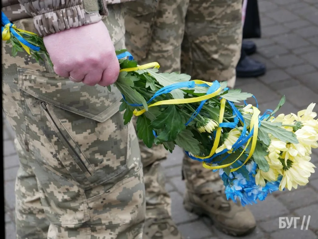 У руках військового — хризантеми, перев’язані жовто-блакитною стрічкою. Поруч — люди з державними прапорами, які майорять як символ пам’яті, вдячності та незламності.