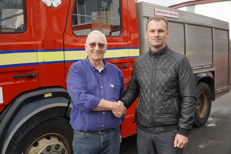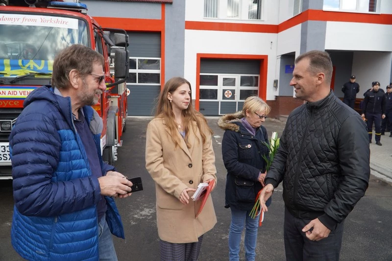 Приїхали британці в Україну не з порожніми руками. Привезли для рятувальників 3-го Державного пожежно-рятувального загону автодрабину та пожежну автоцистерну, які допомагатимуть рятувати життя людей. Прикрашені автомобілі символом Йоркшира – білими трояндами. Серед наліпок і імена двох жінок – Джойс та Вініфред, які є мамою та дружиною благодійників з Британії, котрі внесли найбільшу суму у придбання автомобілів для українських рятувальників.