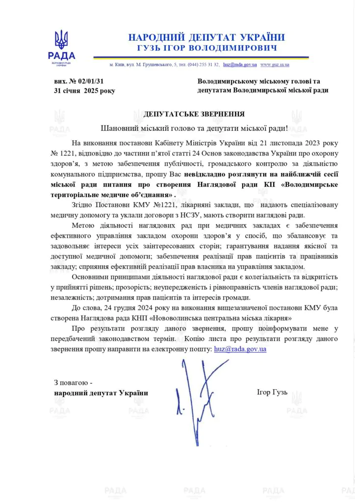 Народний депутат України Ігор Гузь звернувся до міського голови Володимира Ігоря Пальонки та депутатського корпусу із закликом створити Наглядову раду при Володимирському територіальному медичному об’єднанні.