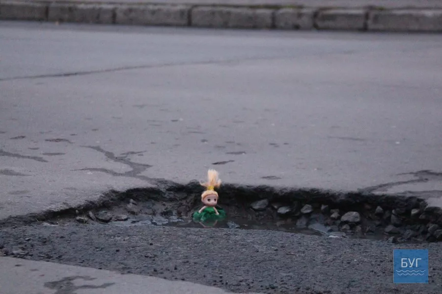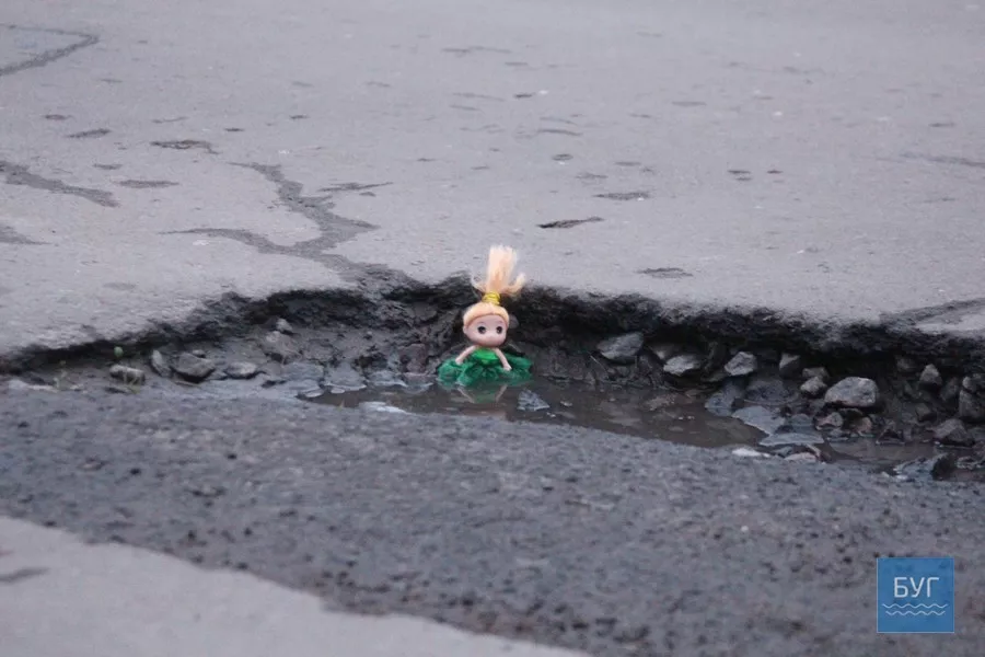 Нагадаємо, Інспектор Ляля в сидячому положенні має ріст 6 сантиметрів і служить нам своєрідним мірилом, яке візуально показує, якими можуть бути глибокими та небезпечними вибоїни на дорогах.