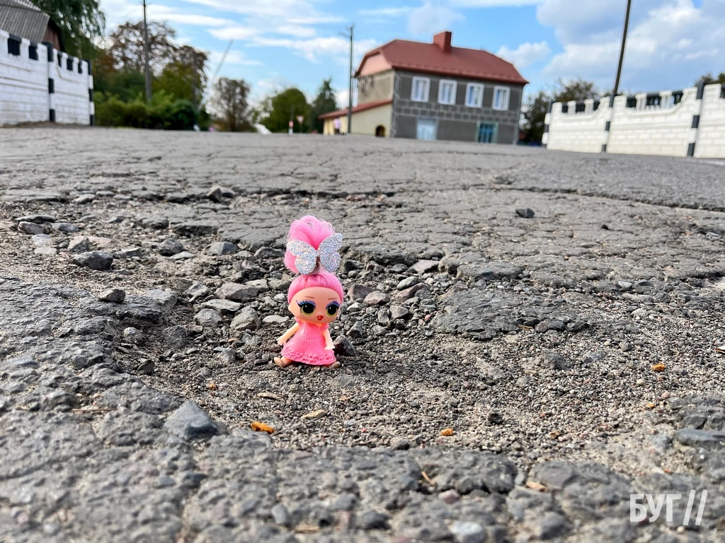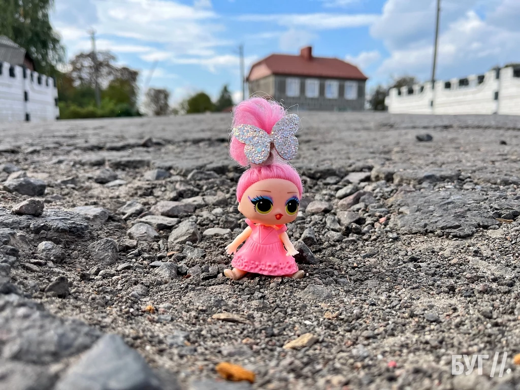 Нагадаємо, що Інспектор Ляля в сидячому положенні має ріст шість сантиметрів і служить нам своєрідним мірилом, яке візуально показує, якими можуть бути глибокими та небезпечними вибоїнами на дорогах.