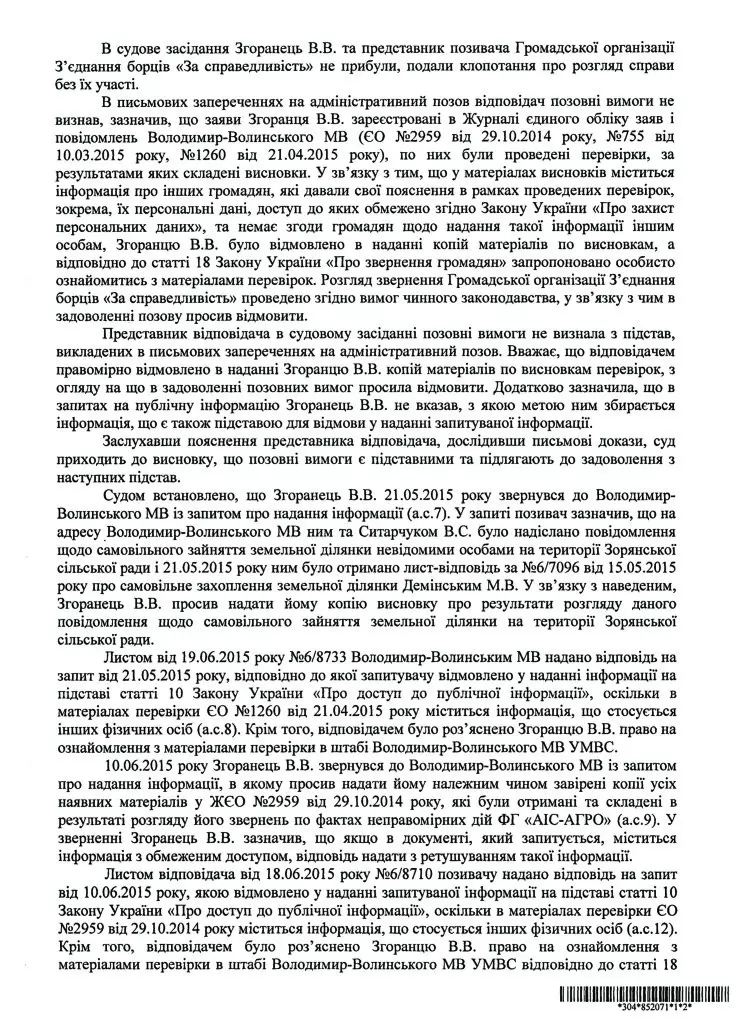Через певний час голова Волинського відокремленого підрозділу борців за справедливість Згоранець Василь знову надсилає письмовий запит до Здомищука, в якому просить надати інформацію про хід розгляду його заяви з наданням підтверджуючих копій відносно неправомірних дій фермерського господарства «АІС-АГРО». І знову стіна. Знову відмова з посиланням на пункт 10 Закону України «Про доступ до публічної інформації». І в цьому випадку є певна конфіденційна інформація відносно фізичних осіб. Тому її оприлюднювати, тим більше, надавати копії якихось документів – категорично заборонено. Але в кінці відповіді начальник міліції вкотре радить звернутися до штабу з метою ознайомлення.