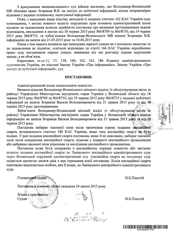 Читаєш постанову і складається враження, що суддя сміявся над тими відповідями начальника міліції. Напевно й він не міг второпати: як же так – в конверті направити відповідь на запитувану інформацію людині не можна, а ось в штабі ознайомитися – будь ласка. Крім того, напевно, і його здивувало оте застосування статті 10 Закону України «Про доступ до публічної інформації», яку так любить цитувати очільник Володимир-Волинської міліції Здомищук Віталій Петрович при наданні відповідей заявникам. Зокрема, борцям за справедливість.”
