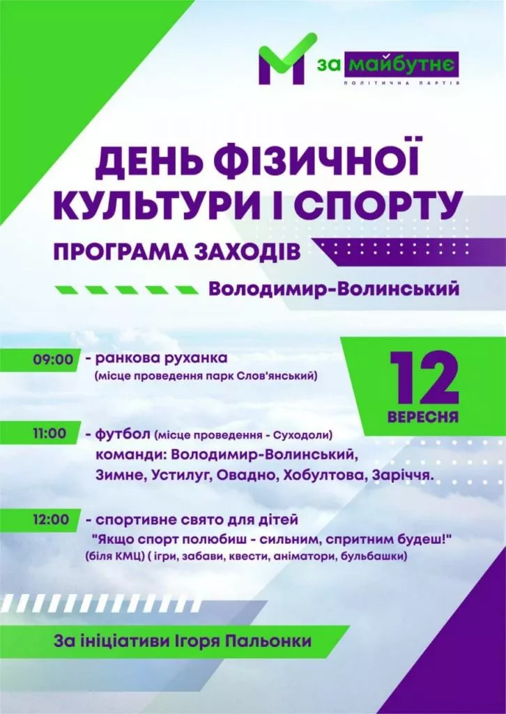 12-го вересня у Володимирі-Волинському відбудеться День фізичної культури та спорту. Захід організовує кандидат у мери княжого міста Ігор Пальонка та команда «За майбутнє».