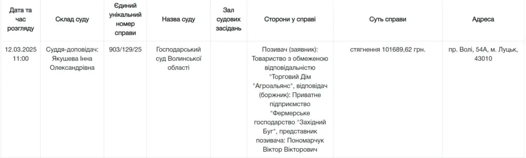 ТОВ “Торговий Дім Агроальянс” також зверталося до суду навесні 2023 року з вимогою повернути 2,5 мільйона гривень. На цей раз, борг Юнак сплатив до винесення судового рішення, що свідчить про системні фінансові проблеми його підприємства.