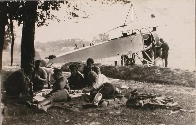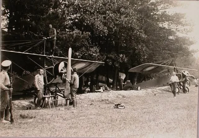 На архівних фотографіях зафіксовано літаки ранньої авіації. Поруч — пілоти, механіки, обслуговчий персонал. Частина військових відпочиває просто на землі, використовуючи ковдри та плащі, частина займається технічними роботами: оглядом двигунів, пропелерів, кріплень і конструкцій крил.