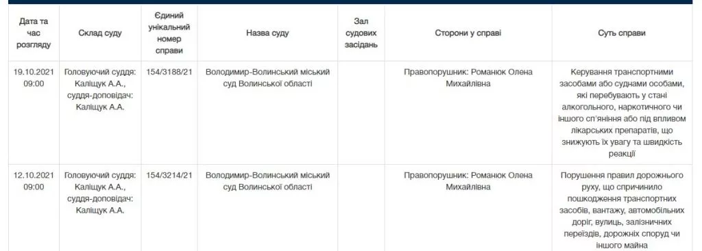 Також на засіданні були присутні двоє інших власників автівок, які постраждали у ДТП, проте їм відшкодували збитки і вони не мали претензій до обвинуваченої. Один із них під час складання протоколу поліції повідомив, що за кермом перебувала Романюк, проте на судді цього не зміг підтвердити, посилаючись на те, що точно не пам’ятає.