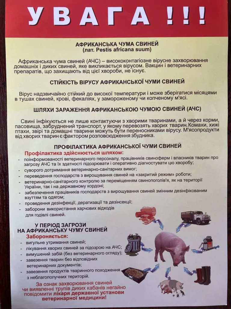 - забезпечити проведення широкої роз’яснювальної роботи серед населення та власників тварин про небезпеку африканської чуми свиней та заходи біозахисту приватних господарств громадян та підприємств діяльність яких пов’язана з вирощуванням та обігом свиней;