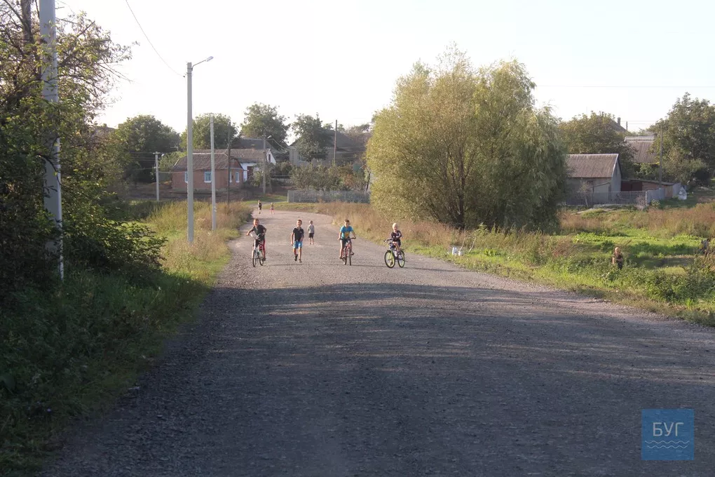 Новосілки зустріли #ДронБуга веселим криком десятка дітлахів, які каталися головною дорогою села на велосипедах.