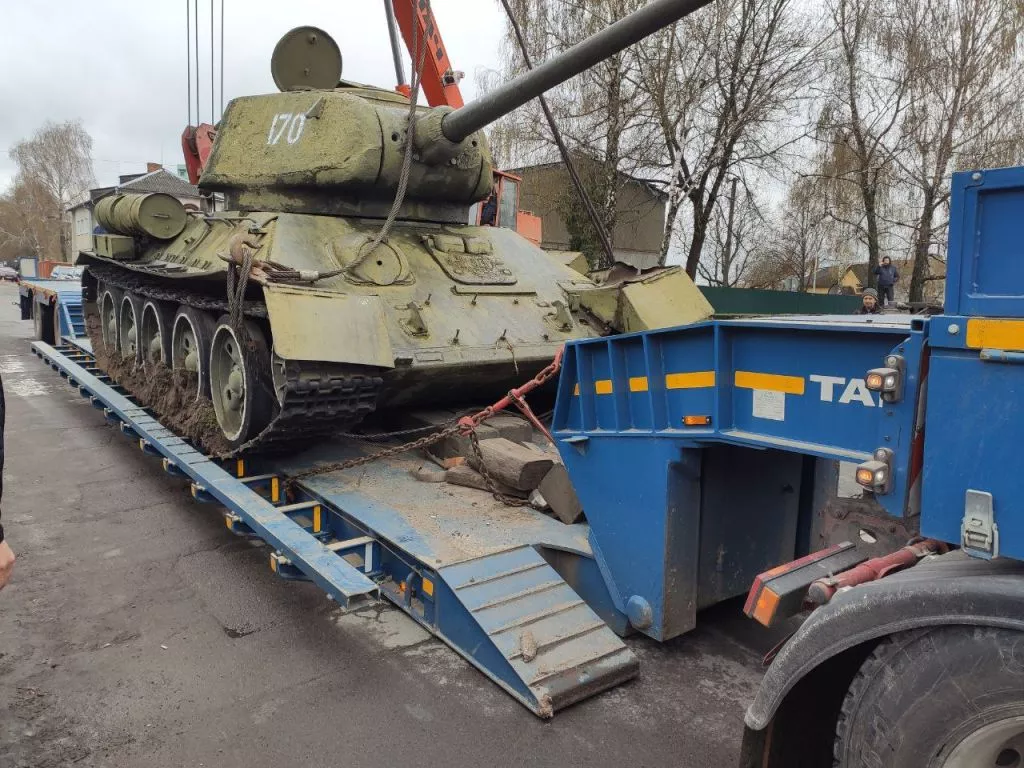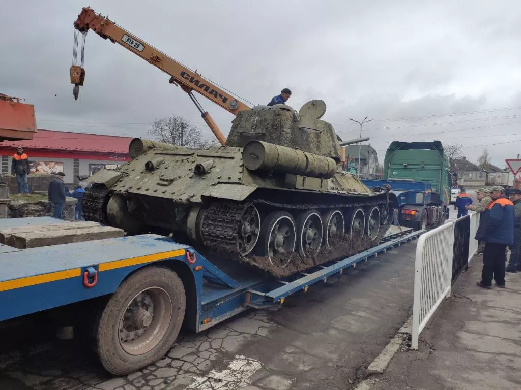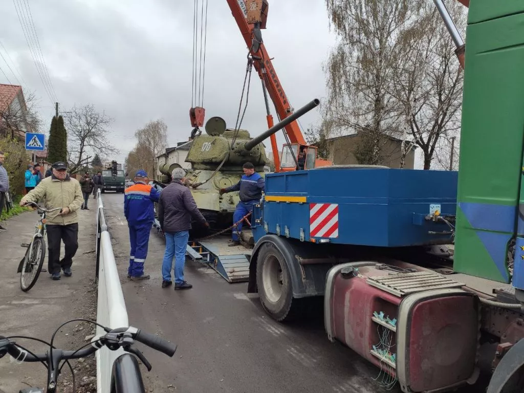 30-тонний танк не хотів зрушати з “насидженого місця”, але, після двогодинних зусиль комунальників – все ж піддався. Після зняття з п’єдесталу, танк помістили на навантажувач та повезли в сторону військової частини.