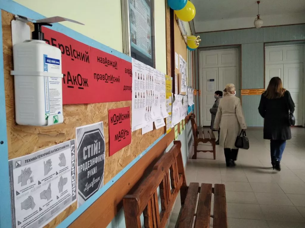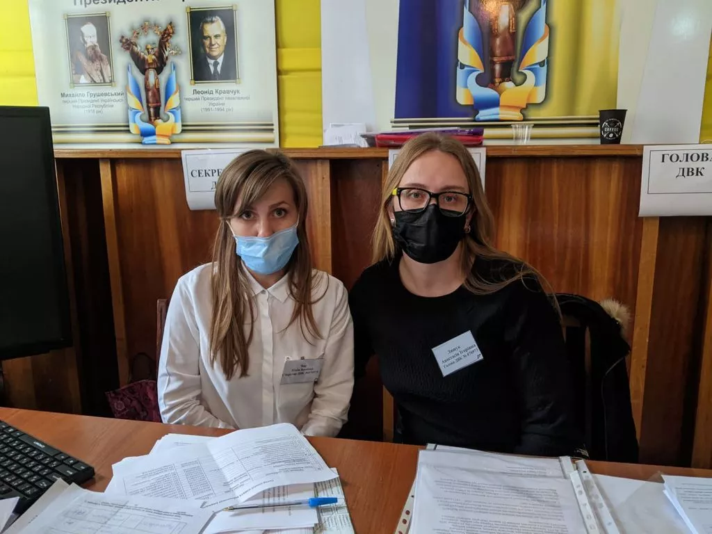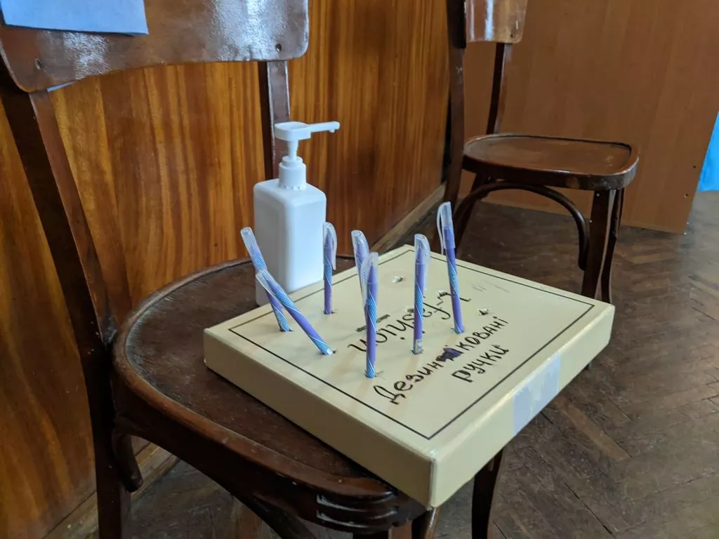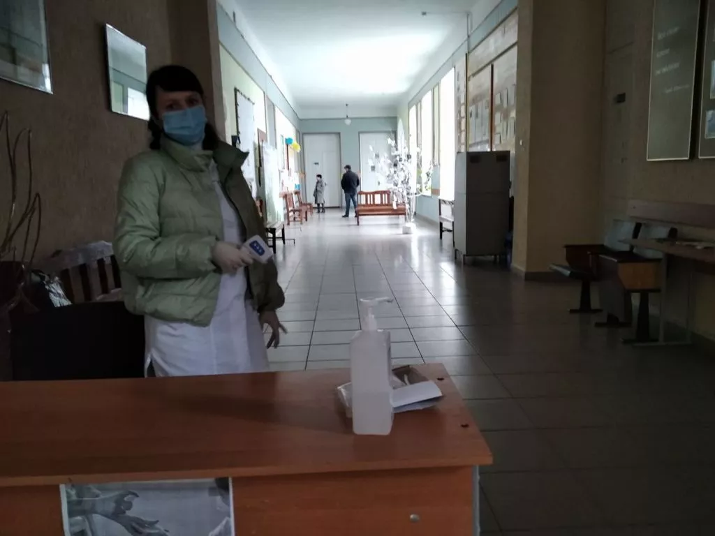 Є кабінка для тих, хто з температурою, кошик для використаних масок, ручки оброблені антисептиком.Також на дільниці 4 спостерігачі та два кандидати.