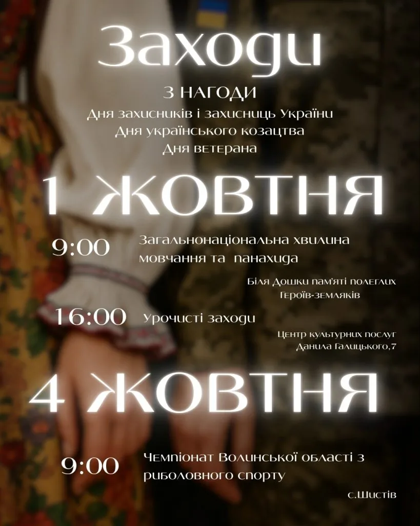 Мешканців та гостей Володимирської громади запрошують долучитися до заходів, присвячених Дню захисників і захисниць України, Дню українського козацтва та Дню ветерана, що відбудуться 1-го та 4-го жовтня.
