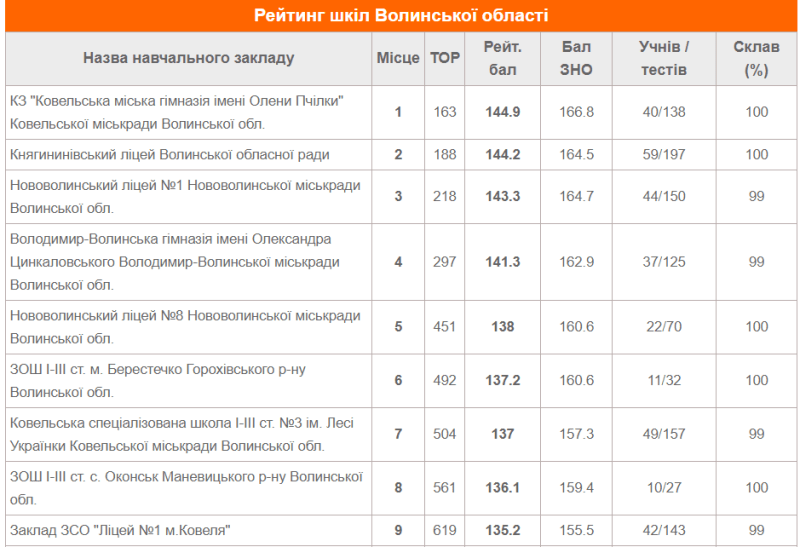 Склали рейтинг загальноосвітніх шкіл Волинської області за підсумками зовнішнього незалежного оцінювання 2020 року. Навчальні заклади Нововолинська та Володимира увійшли у топ-10.