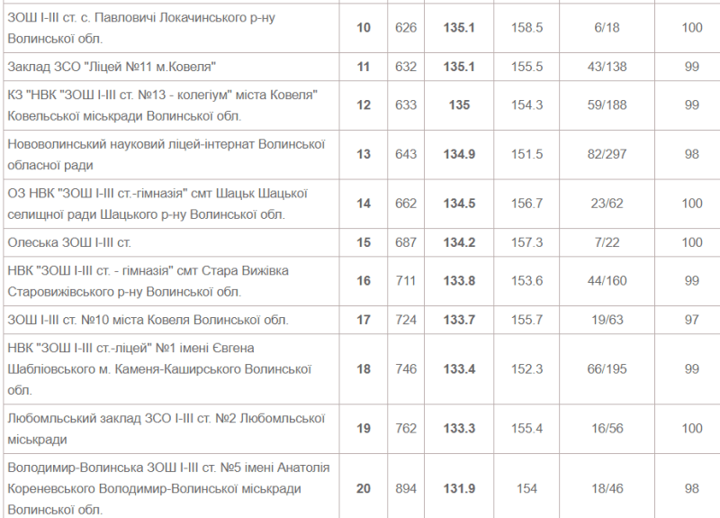 Так на 3-ому місці знаходиться Нововолинський ліцей №1 (99% випускників склали тест із ЗНО), на 4-му Володимир-Волинська гімназія ім. О. Цинкаловського (99% випускників успішно склали ЗНО), на 5-му Нововолинський ліцей №8 (100% склали ЗНО).