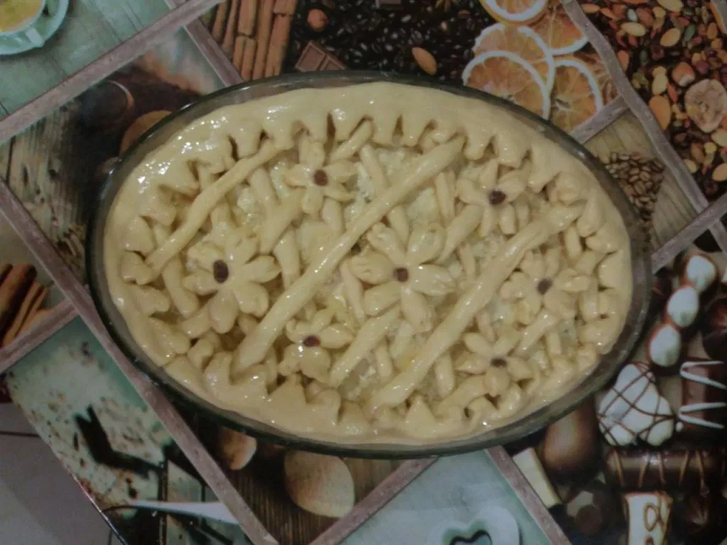 Розкачую тісто на бляшку. На нього кладу творог і поверху нього роблю сіточку з тіста та змащую її яйцем.
