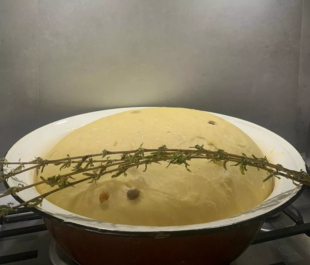 Робимо опару: на 1 літр теплого молока розчиняємо 150гр дріжджів, за трохи додаю 15 яєць і 10 жовтків. Далі розтираю 3 ст. цукру зі 150 гр. маргарину та 150-200гр. вершкового масла – додаю то все в опару, розмішую… Далі додаю 2-3 ст. ложки олії, одну пачку ваніліну та 1 стакан попередньо замочених родзинок. Все вимішуємо впродовж години. Лишити рухатися у мідниці. Накриваю його вишитим рушником, а зверху кладу освячену гілочку верби… Тісто має збільшити вдвічі.