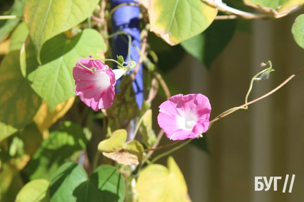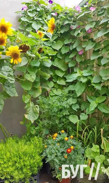 На вході до вбиральні цвітуть чорнобривці, петунія, соняшники, домашні вазони та інша рослинність.
