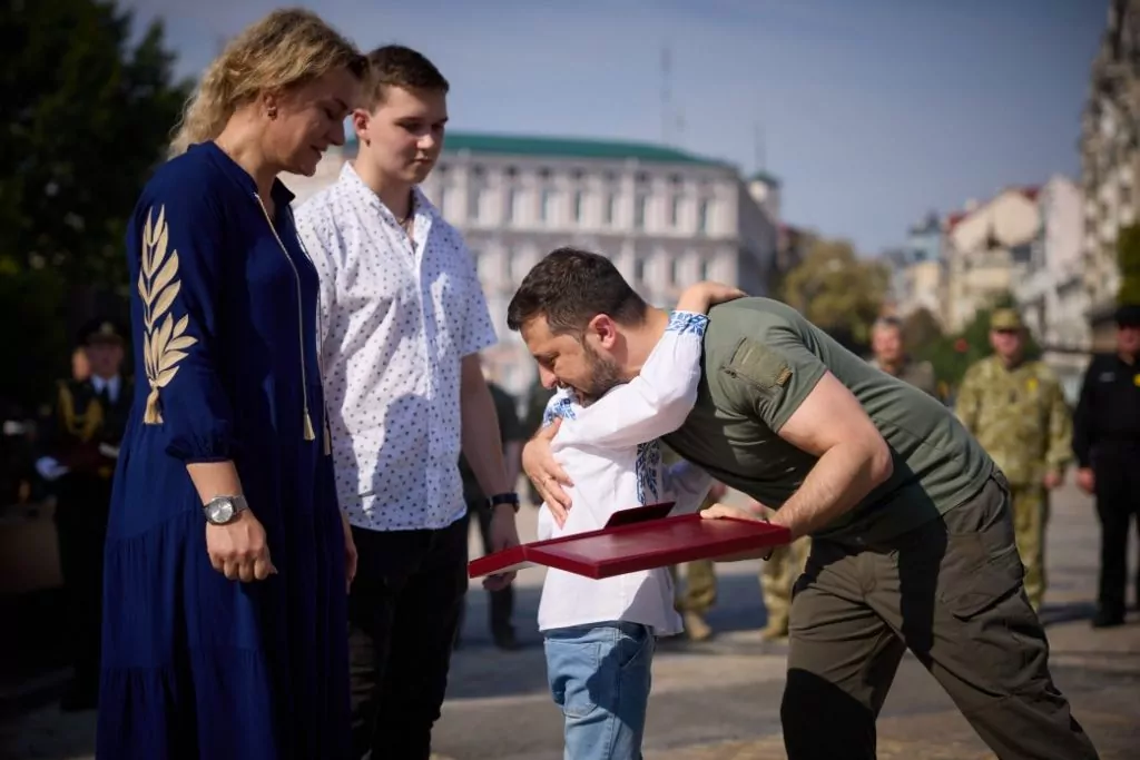 «Немає таких слів, яких було б достатньо, щоб описати повністю ту силу, велич і самопожертву героя, який залишається навічно в бою, щоб тільки його народ зберіг волю та здобув перемогу. Слова завжди менші, ніж те, що ми відчуваємо. І хай сльози, які будуть сьогодні, хай мовчання, яке сьогодні звучатиме гучніше, ніж будь-які слова, хай наша шана, яка є абсолютно щирою, скаже всім, що ми відчуваємо насправді та наскільки ми вдячні всім нашим захисникам і захисницям, чиє життя стало життям України», – сказав Володимир Зеленський.