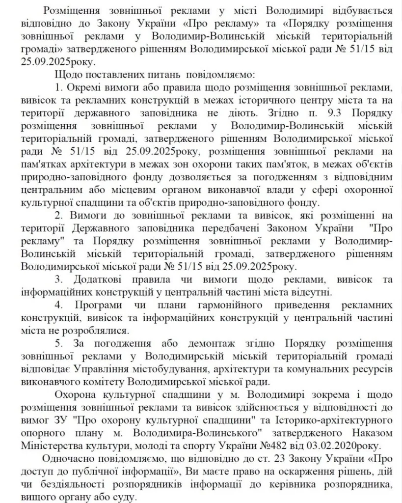 Запитали просто: чи є правила для історичного центру, чи затверджені вимоги до вигляду вивісок, чи є план впорядкування реклами, хто контролює ситуацію і хто має демонтовувати порушення. Бо поки що виглядає так, що правил або немає, або вони існують лише на папері.