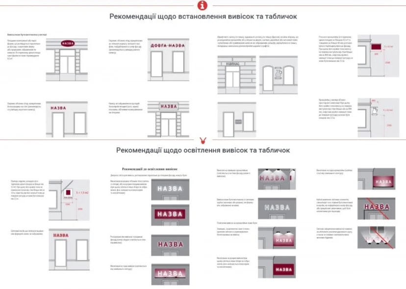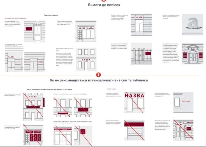 Щодо вивісок — теж усе доволі загально: обмеження по площі, заборона втручання в конструкції будівель, можливість демонтажу.