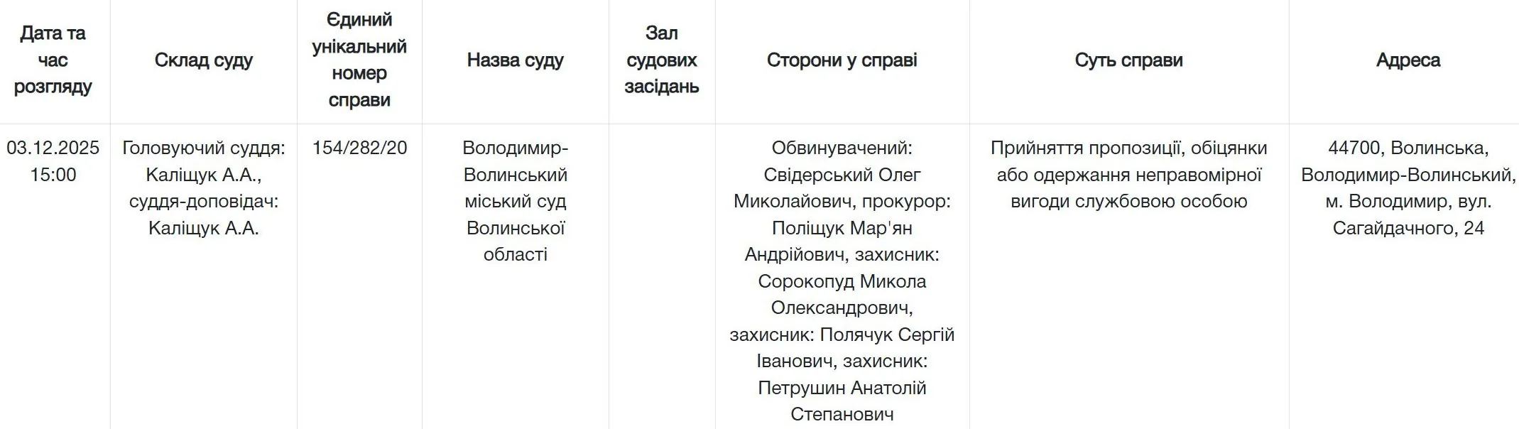 Справу про хабар колишнього заступника міського голови часів Саганюка, а нині депутата Володимирської міської ради Олега Свідерського, відкриту ще 6 років тому, фактично «заморожено». За роки судового «розгляду» немає жодного руху по суті. І тут закономірно виникає питання: чи не веде багаторічне затягування до того, щоб провадження просто закрили за строками давності?