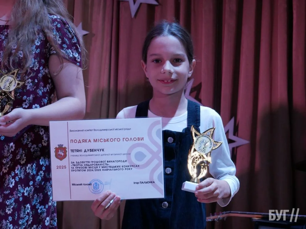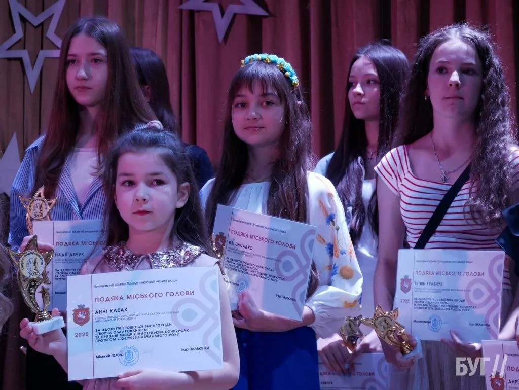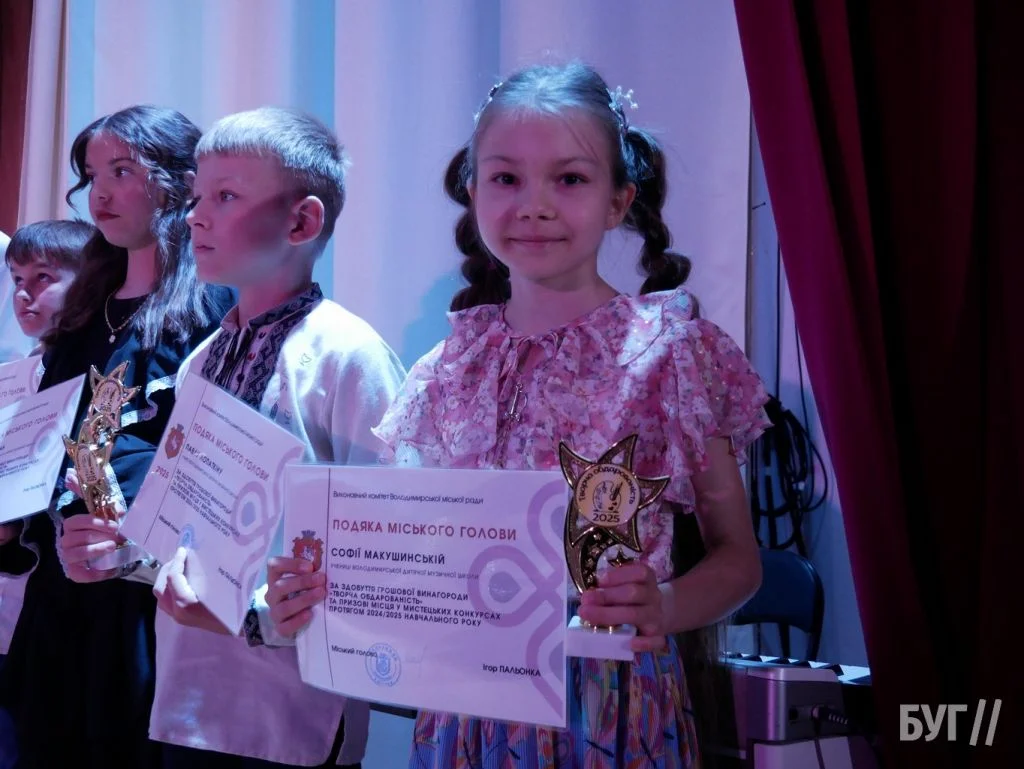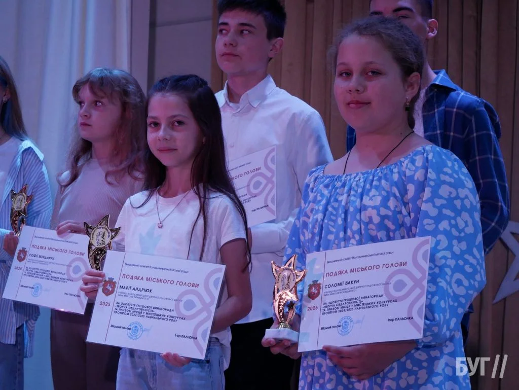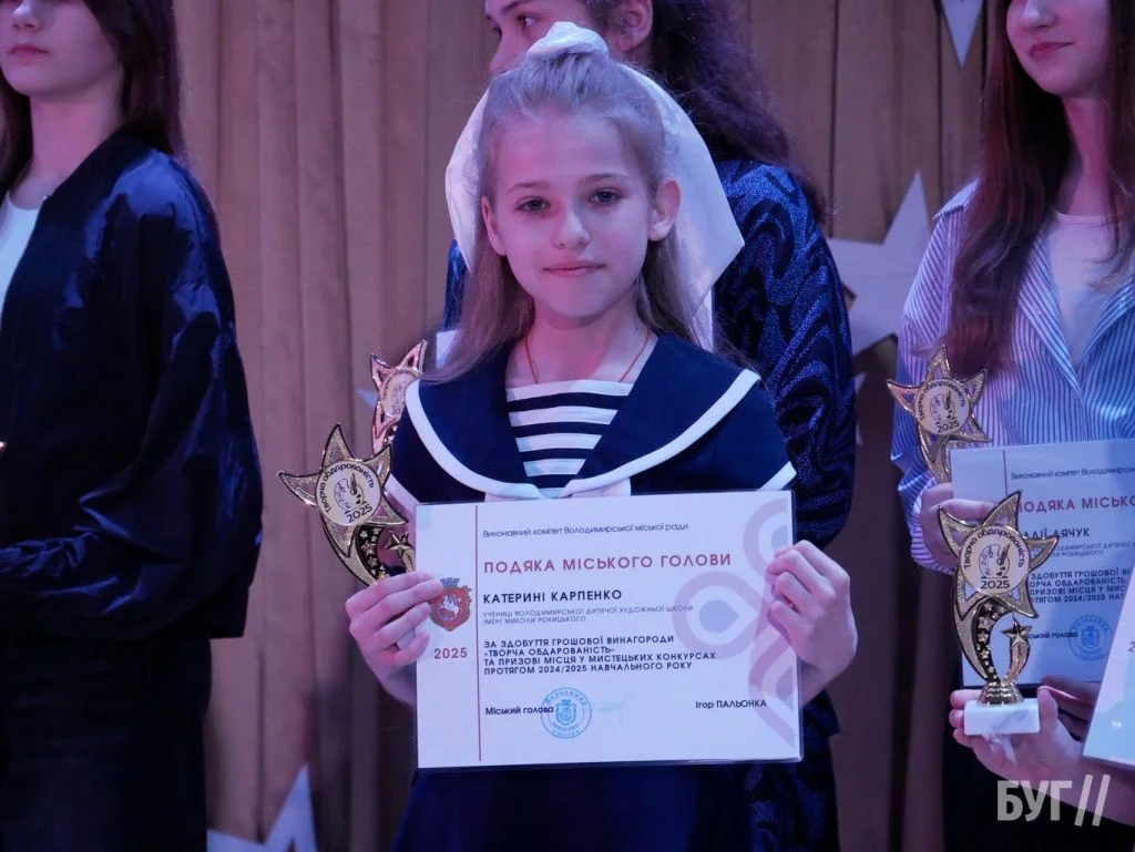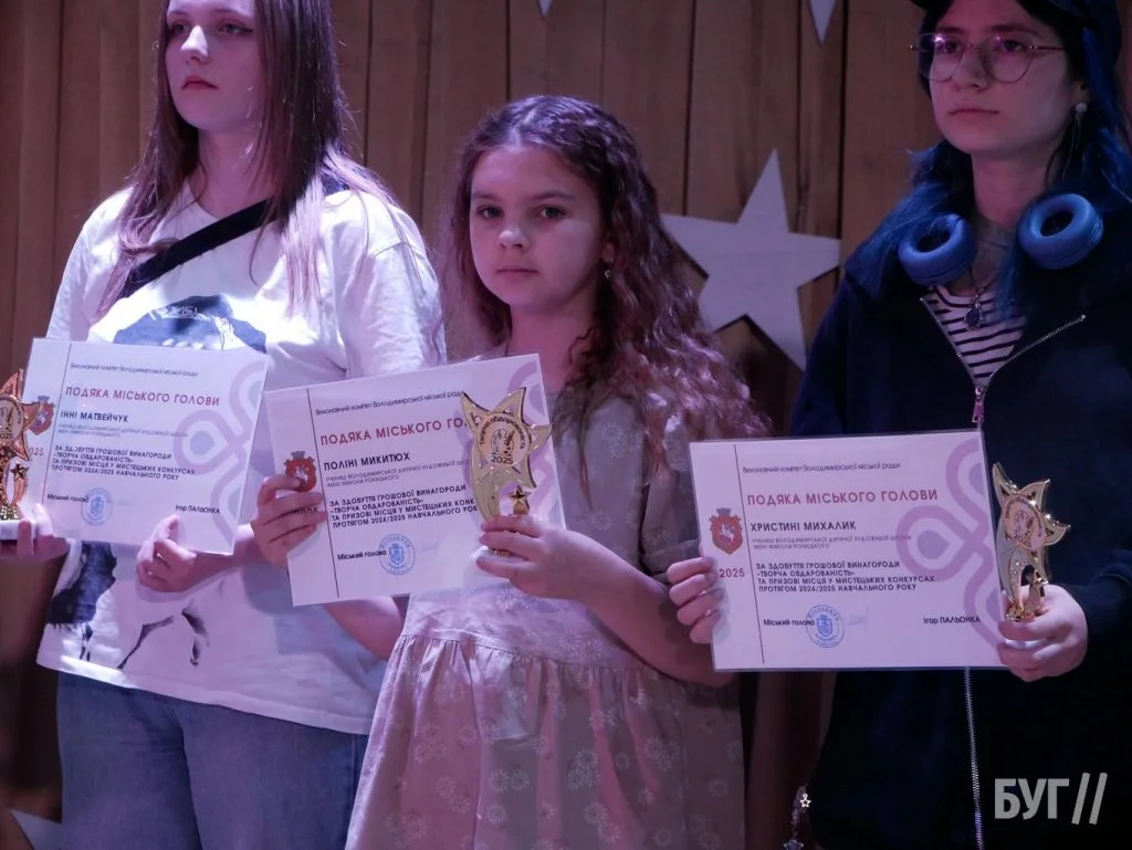 Секретар міської ради Іван Юхимюк та начальниця відділу культури і мистецтва Олена Омелюх вручили Подяки міського голови, грошові винагороди та статуетки «Творча обдарованість» 52 учням Володимирської дитячої музичної школи й 107 учням дитячої художньої школи імені Миколи Рокицького. Ці відзнаки — символ визнання щоденної праці, наполегливості та віри у власні сили.