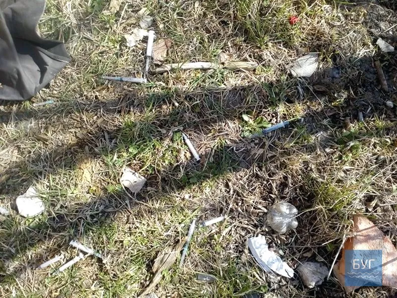 Саме біля входу. Чи люди їх викидають, чи нашестя наркоманів через карантин – незрозуміло, адже і стихійних смітників стало більше. І то я ще не мав часу зайти вглиб території. Окрім шприців валяються і всілякі пристовування для вживання наркотиків”.