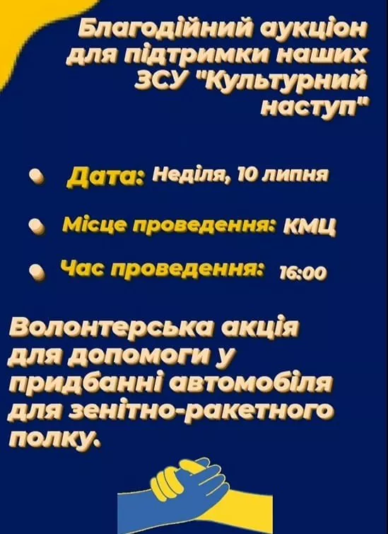 10-го липня о 16:00 у культурно-мистецькому центрі Володимира відбудеться благодійний аукціон спрямований на збір коштів для допомоги та підтримки бійців української армії.