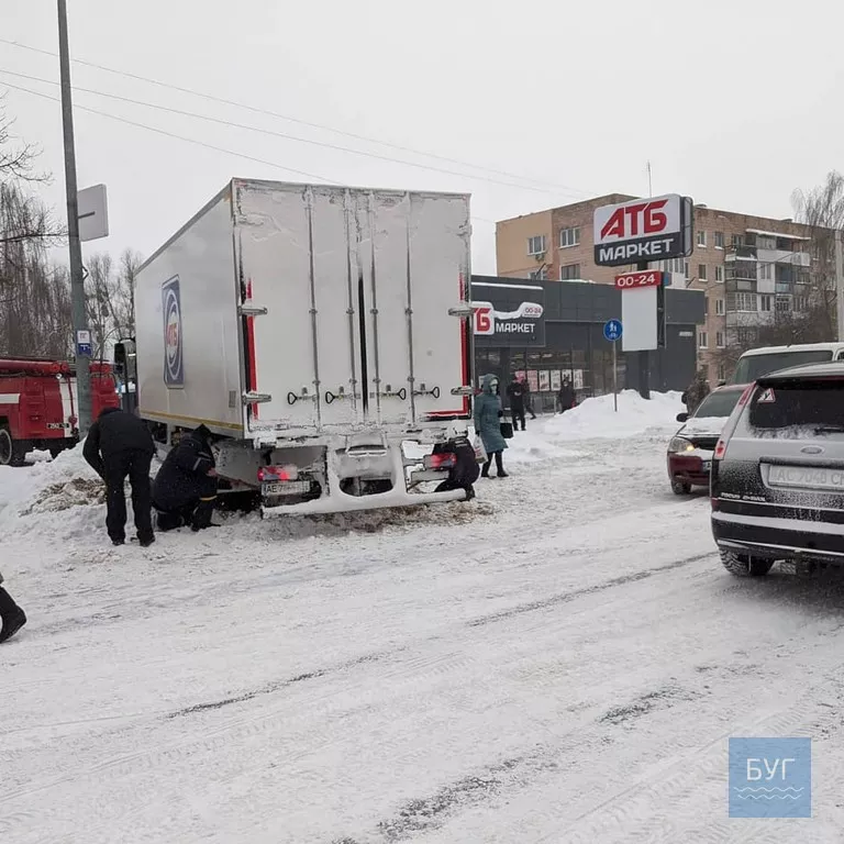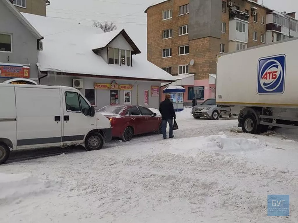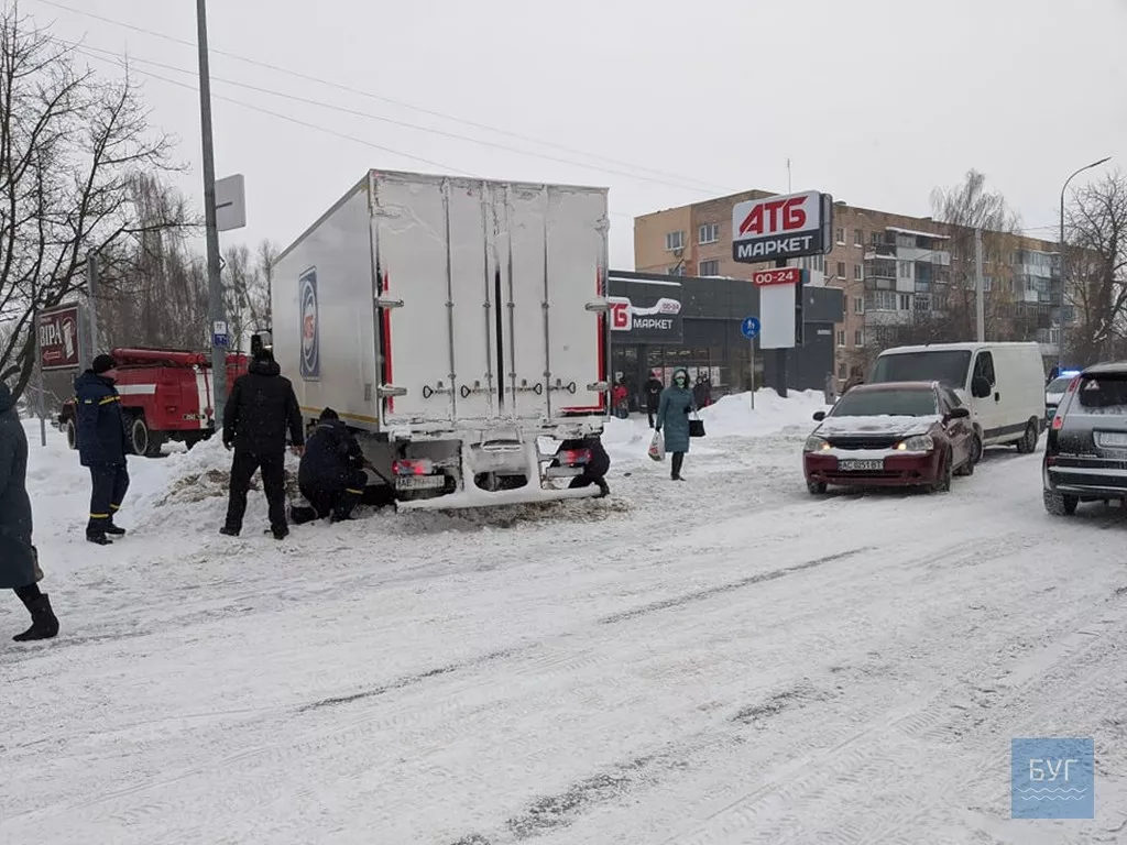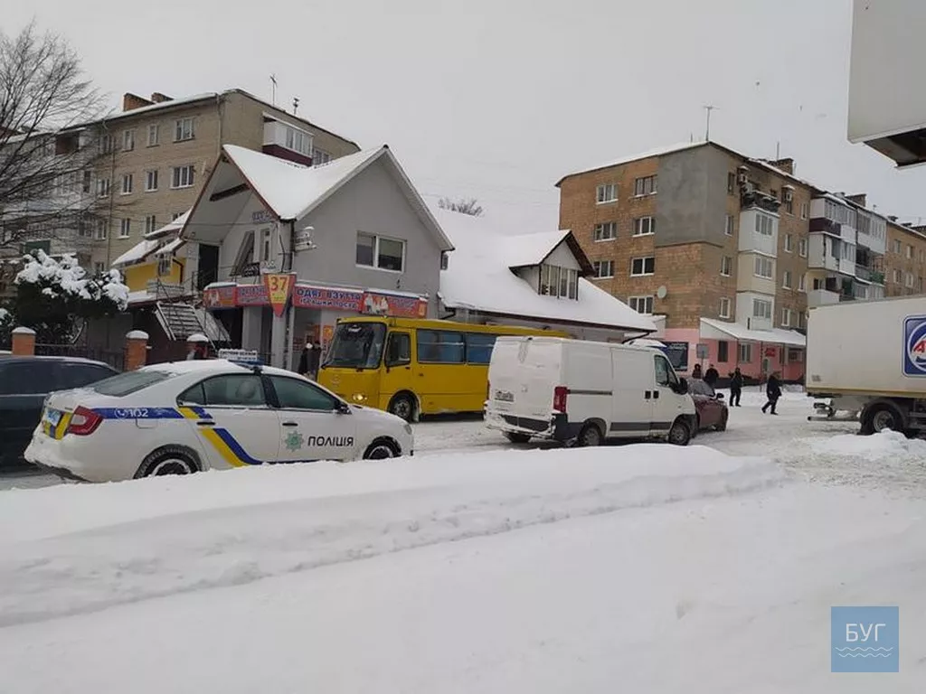 Перед пішохідним переходом зіткнулися легковик Шевроле та бус Пежо Боксер. Згодом вантажівка, яка доставляла товар в маркет, намагаючись об’їхати ДТП, застрягла у сніговому заметі.