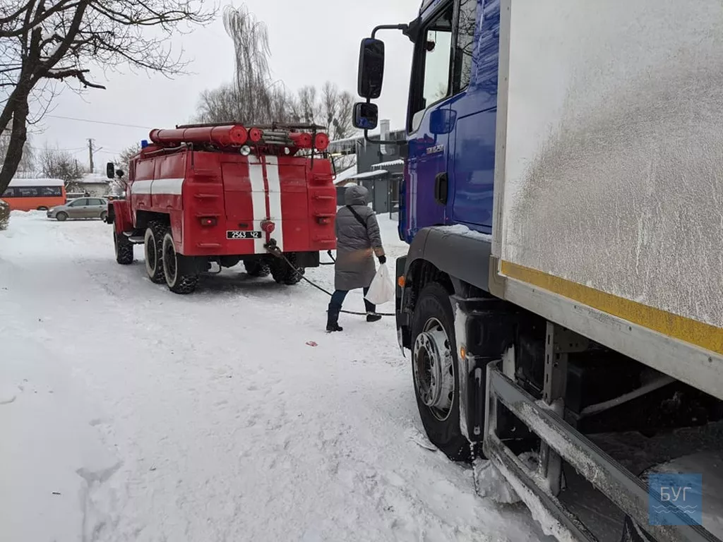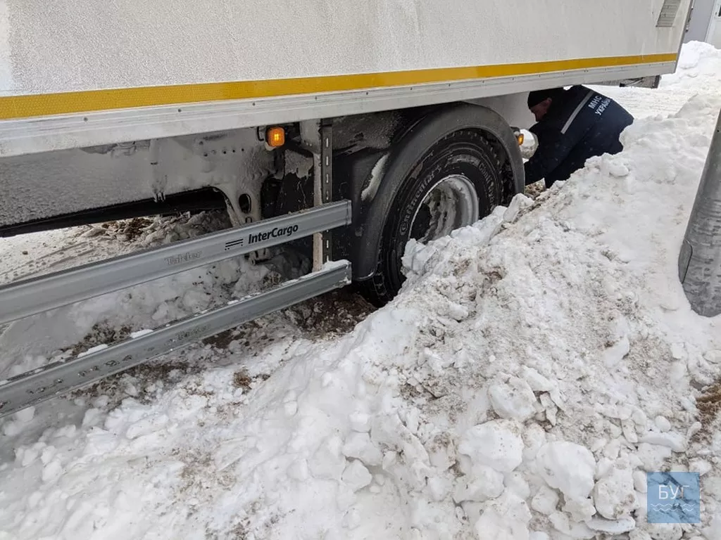 На місці працювали правоохоронці. Вивільняти вантажівку приїхали рятувальники. Зі снігового замету її виштовхали на дорогу близько семи чоловіків, зокрема рятувальники, працівники магазину та водії.