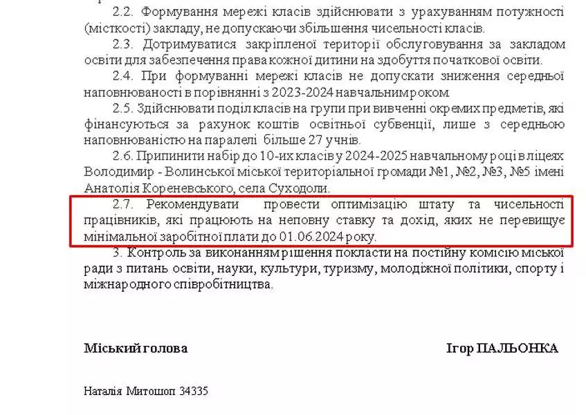 «Рекомендувати провести оптимізацію штату та чисельності працівників, які працюють на неповну ставку та дохід, яких не перевищує мінімальної заробітної плати до 01.06.2024 року», – йдеться у проєкті рішення.