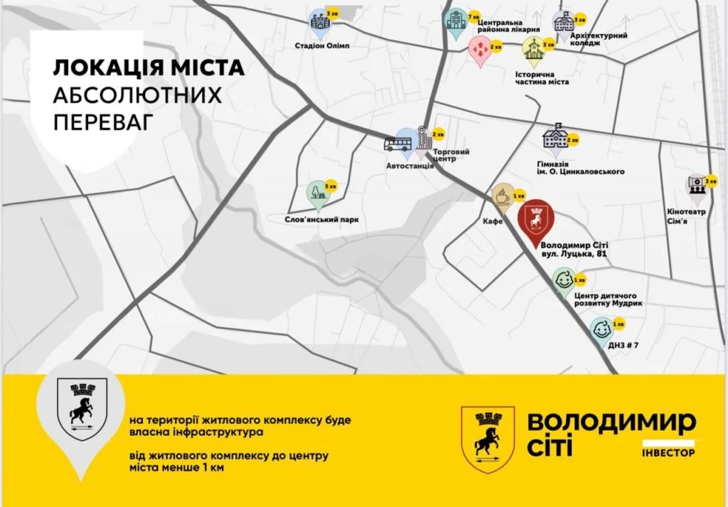 Житловий комплекс розміщується поруч з однією з головних магістралей міста, що забезпечує легкий доступ до центру Володимира всього за 5 хвилин пішки. Одночасно локація дозволяє відчути тишу та затишок, не порушуючи ритму міського життя.