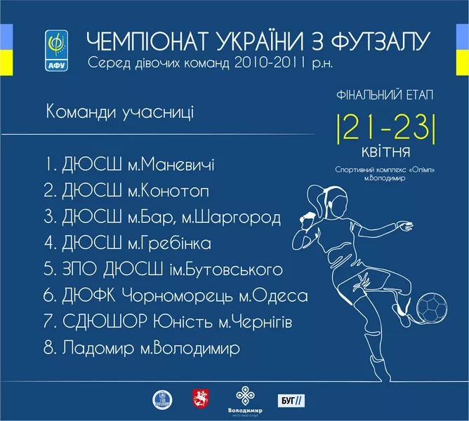 З 21-го по 23-тє квітня у Володимирі відбудеться фінальний етап чемпіонату України з футзалу серед дівочих команд 2010-2011 року народження.