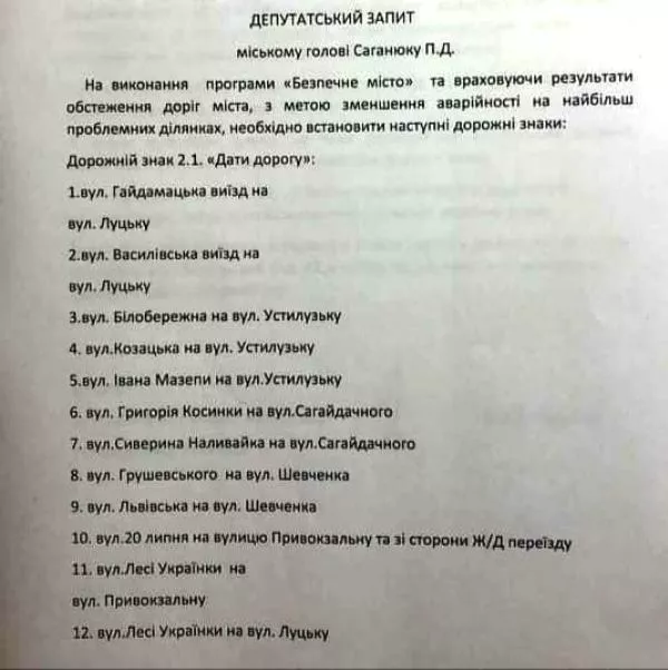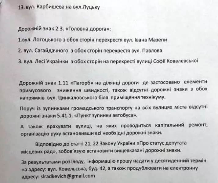 Запит, як розповів Радкевич, був підготований в результаті обстеження доріг міста разом з фахівцями приватної автошколи. Депутат представив перелік перехресть та місць, де варто встановити знаки.